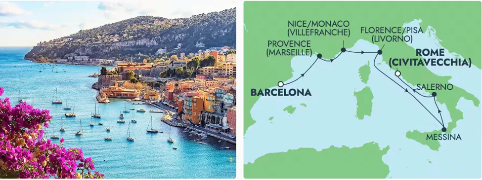 Barcelona, Spain > Provence (Marseille), France > Nice/Monaco (Villefrance), France > Florence/Pisa (Livorno), Italy > At Sea > Messina (Sicily), Italy > Salerno, Italy > Rome (Civitavecchia), Italy