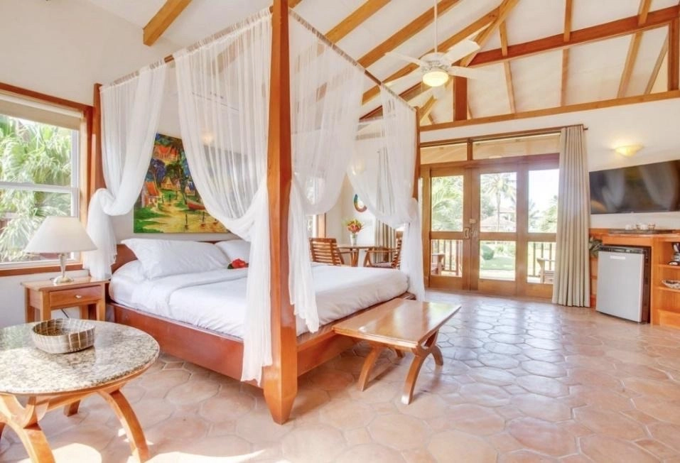 Our villa offers three bedrooms, each with its own en-suite bathroom, along with an open-concept kitchen, dining, and living area. These spacious villas provide over 1800 square feet of indoor and outdoor living space, spanning two floors. The top floor features a generous master bedroom (Premium Suite) which has 1 king bed + 1 futon. On the bottom floor, you’ll find two additional bedrooms: a second master (Suite) which has 1 king bed + 1 futon and a standard bedroom (Standard) with 1 king bed.